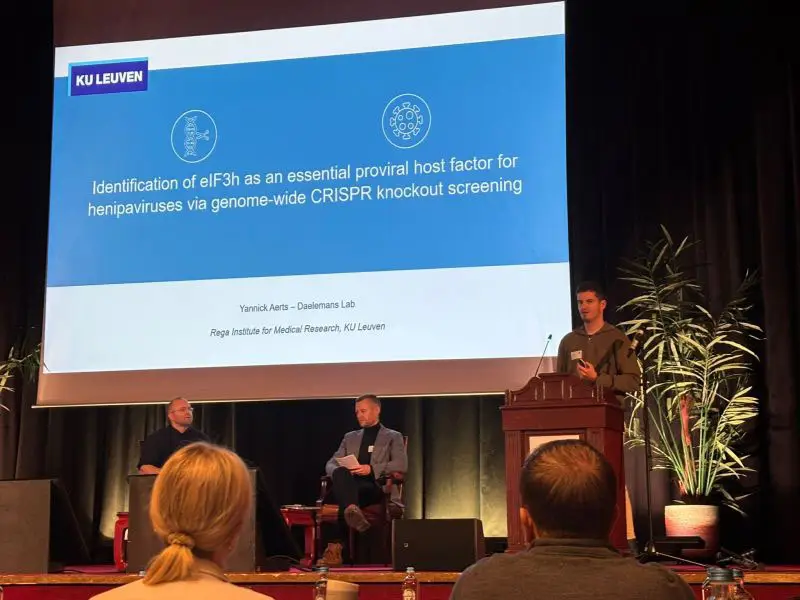 We are proud to highlight that Yannick Aerts recently presented his research at the 13th Annual BELVIR Symposium, titled “Identification of eIF3h as an essential proviral host factor for henipaviruses via genome-wide CRISPR knockout screening.”